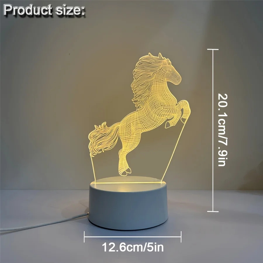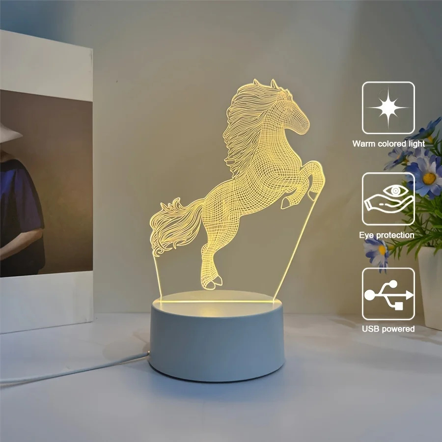 مصباح ثلاثي الأبعاد على شكل حصان، مع قاعدة توفر إضاءة دافئة أحادية اللون. مثالي كهدية عيد ميلاد للأصدقاء، ويصلح لغرفة النوم أو غرفة المعيشة لإضافة جو رومانسي وعصري.