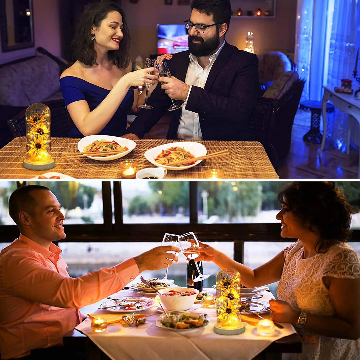 مصباح فاخر يحتوي على زهرة عباد الشمس الاصطناعية داخل قبّة زجاجية مضيئة بتقنية LED. يعطي جو ساحر ورومانسي، مثالي كهدية للنساء أو لتزيين غرفة الذكرى بطريقة فاخرة وجذابة. 🌻✨💡