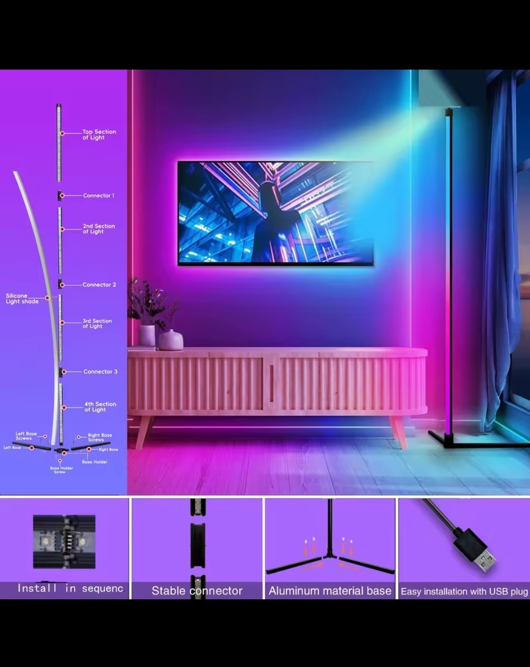 مصباح زاوية ذكي مع خاصية القدرة على تغيير الألوان من خلال التطبيق الخاص به والتزامن مع الموسيقى بأرتفاع 155 سم سهل التركيب.